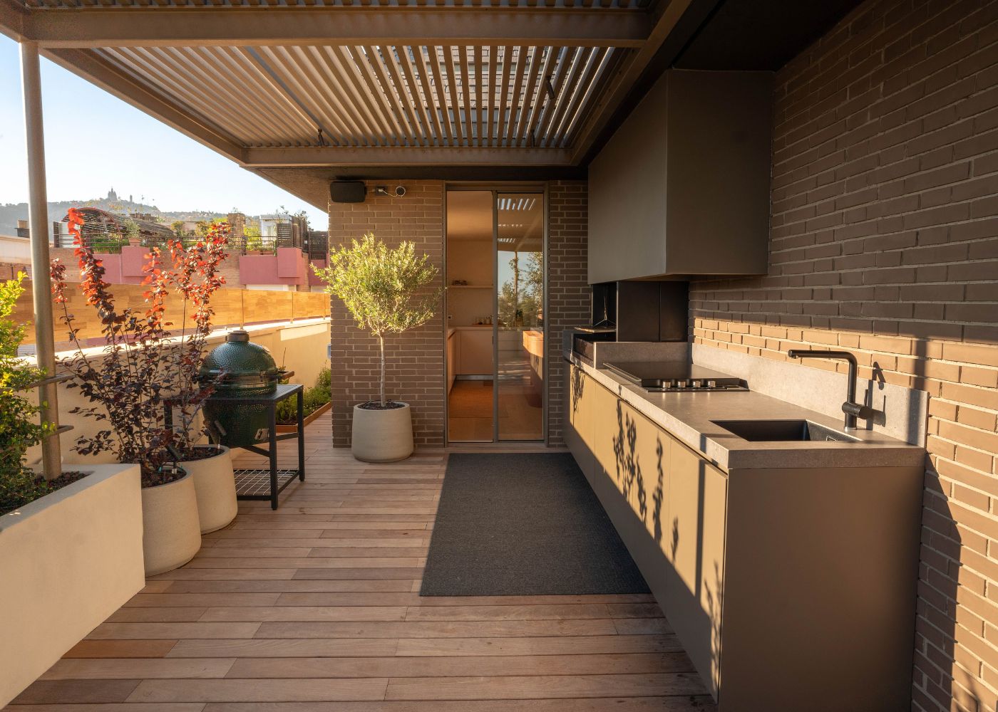 En terrasse d’appartement ou sur un rooftop, la cuisine extérieure prolonge naturellement les espaces intérieurs.